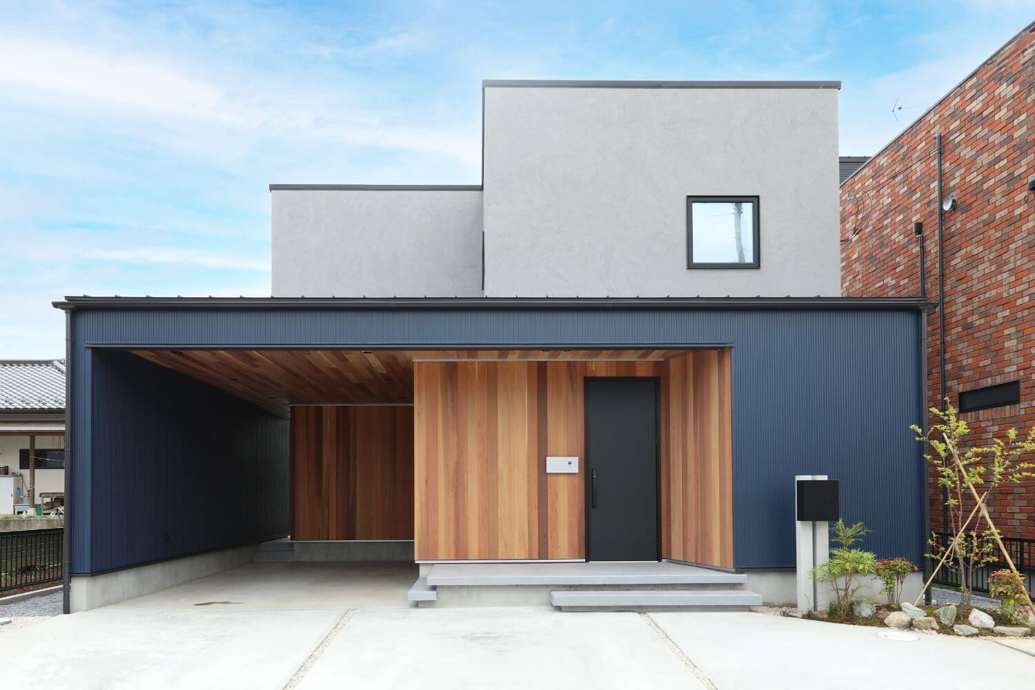 三角屋根×キューブが目を引く、おしゃれな塗り壁の外観に、愛車を雨風から守れる「インナーガレージ」を設けました。 玄関ポーチには、石の風合いをリアルに再現した「ダルストーンペイブ」を採用。玄関を入ると、「無垢のベンチ」と「モルタル仕上げの広々土間収納」が出迎えてくれて、まるで洗練されたショップのような空間に仕上がっています!