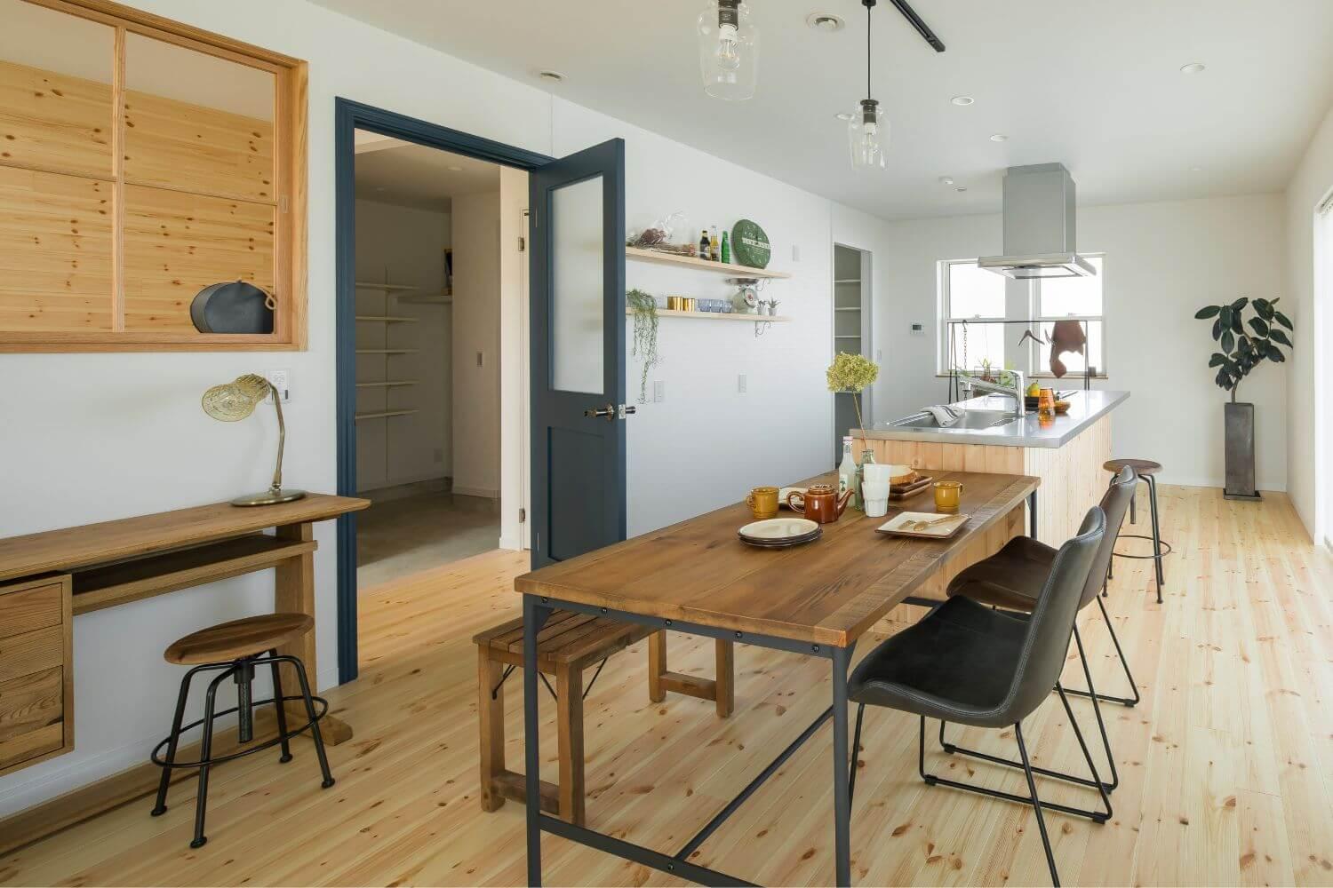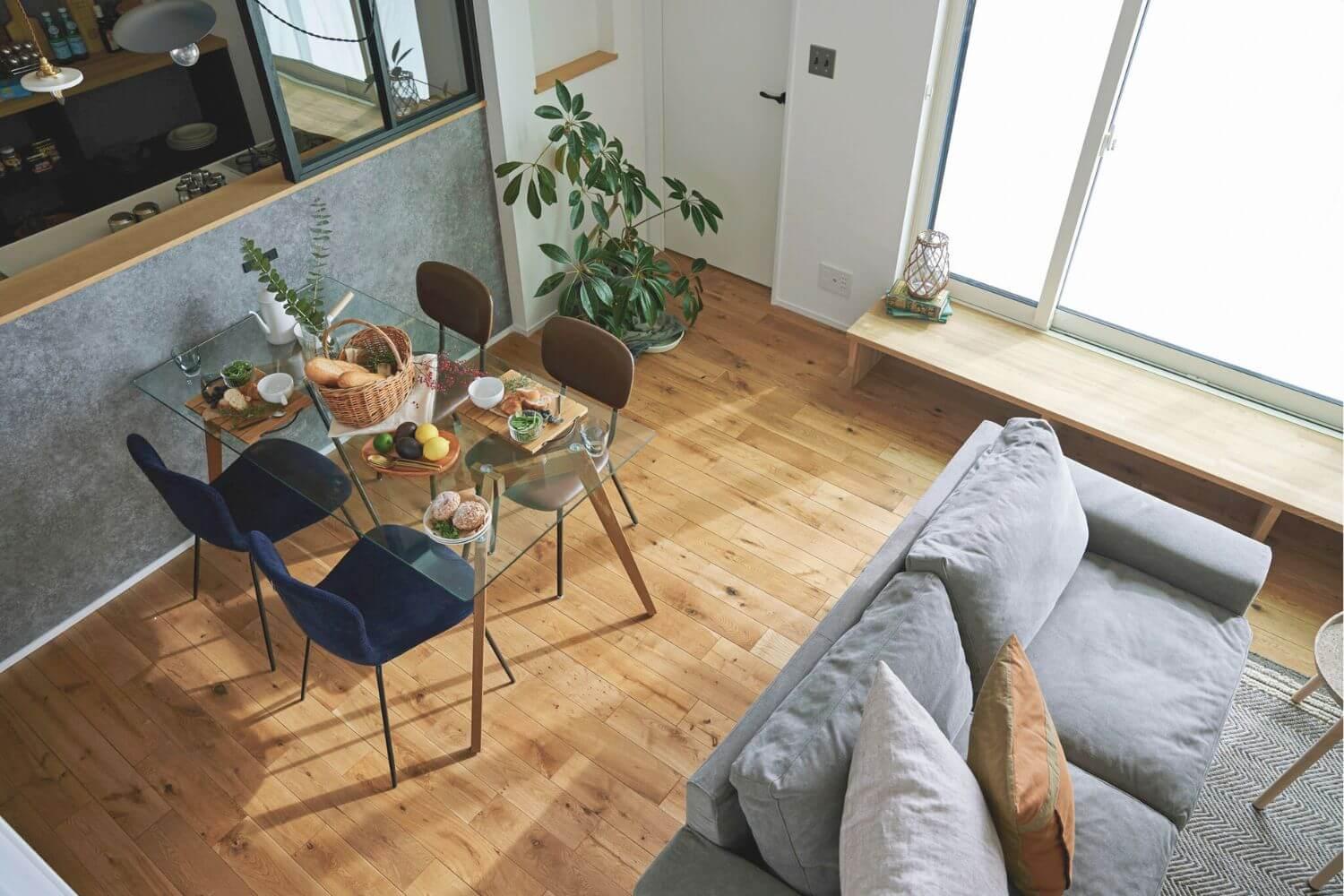 「オークの無垢床」が心地よい変形LDKは、リビングとダイニングをゆるやかに分けて、家族それぞれのくつろぎ方を大切にしました。木の風合いが感じられる天井が空間にあたたかみを添え、「モールテックス仕上げ」のキッチン腰壁や背面のブルーのアクセントクロスがほどよいスパイスに。ナチュラルさとインダストリアルな雰囲気が心地よく調和した、おしゃれなLDKの完成です。